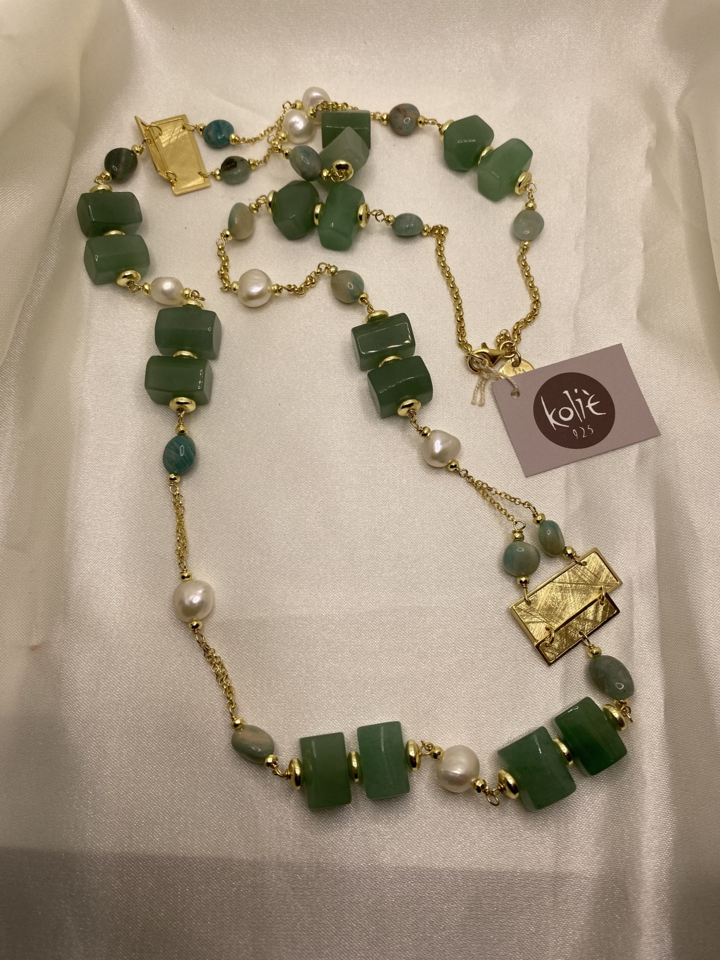 Collana Koliè in argento dorato con giada canadese e amazzonite e perle. lunghezza cm 43