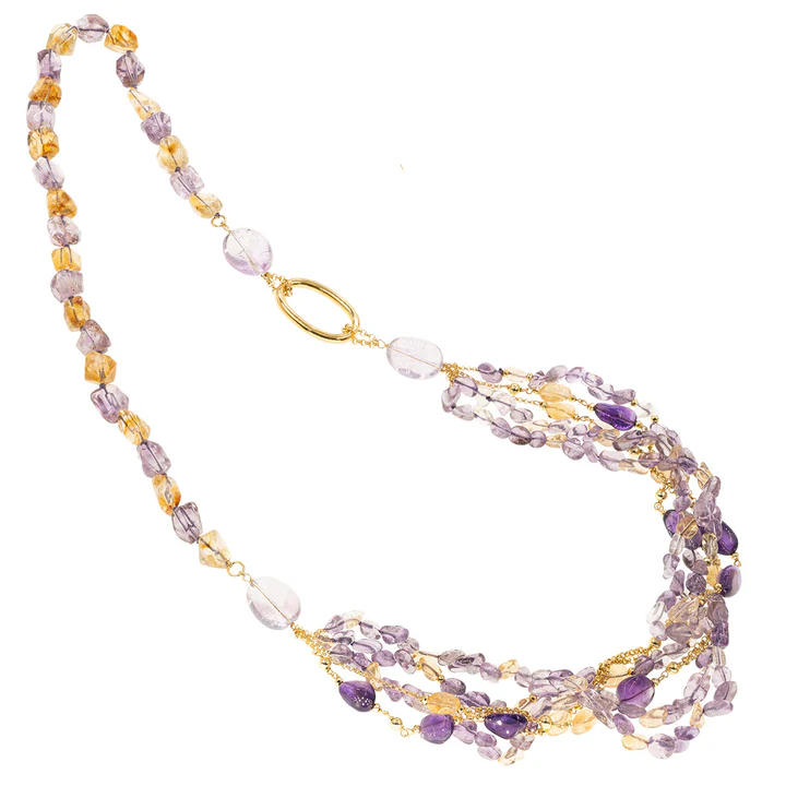 Collana Koliè argento dorata 925 con pietre ametiste e quarzo citrino. Lunghezza cm.38, scatola e garanzia.