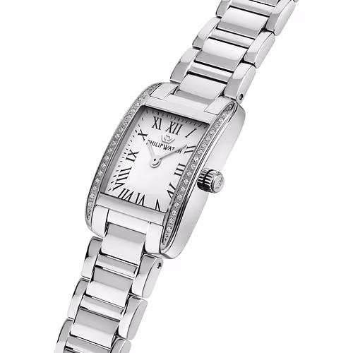 Orologio Philip Watch donna con diamanti , collezione Museum. Materiale e finitura cassa: Acciaio e diamanti, misura cassa: 25.00×34.00mm, spessore cassa: 7.50mm. Finitura cassa: Lucido, vetro zaffiro, materiale cinturino: Acciaio, chiusura: Fibbia farfalla con pulsanti, movimento: Quarzo. Resistente all’acqua metri 3. Scatola e garanzia 2 anni.